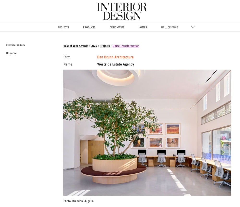 Westside Estate Agency has earned the prestigious title of a 2024 Best of Year Honoree in the category of Best Office Transformation, as recognized by Interior Design Magazine. This accolade celebrates Dan Brunn’s, FAIA, exceptional efforts in reimagining and revitalizing Westside Estate Agency’s workspace, creating an environment that seamlessly blends functionality, innovation, and aesthetic excellence. The recognition highlights the agency’s commitment to fostering a cutting-edge office design that not only enhances productivity but also sets a new standard for creative and inspiring professional spaces in the real estate industry.